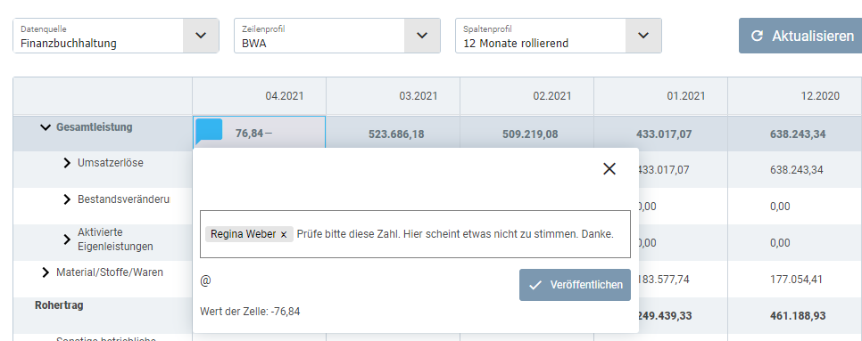 Reports können einfach kommentiert werden. Über sogenanntes „Tagging“ anderer Kollegen erhalten diese automatisch eine Nachricht, so dass ein Chat-Verlauf zum Report mit Benachrichtigungen ermöglich wird.